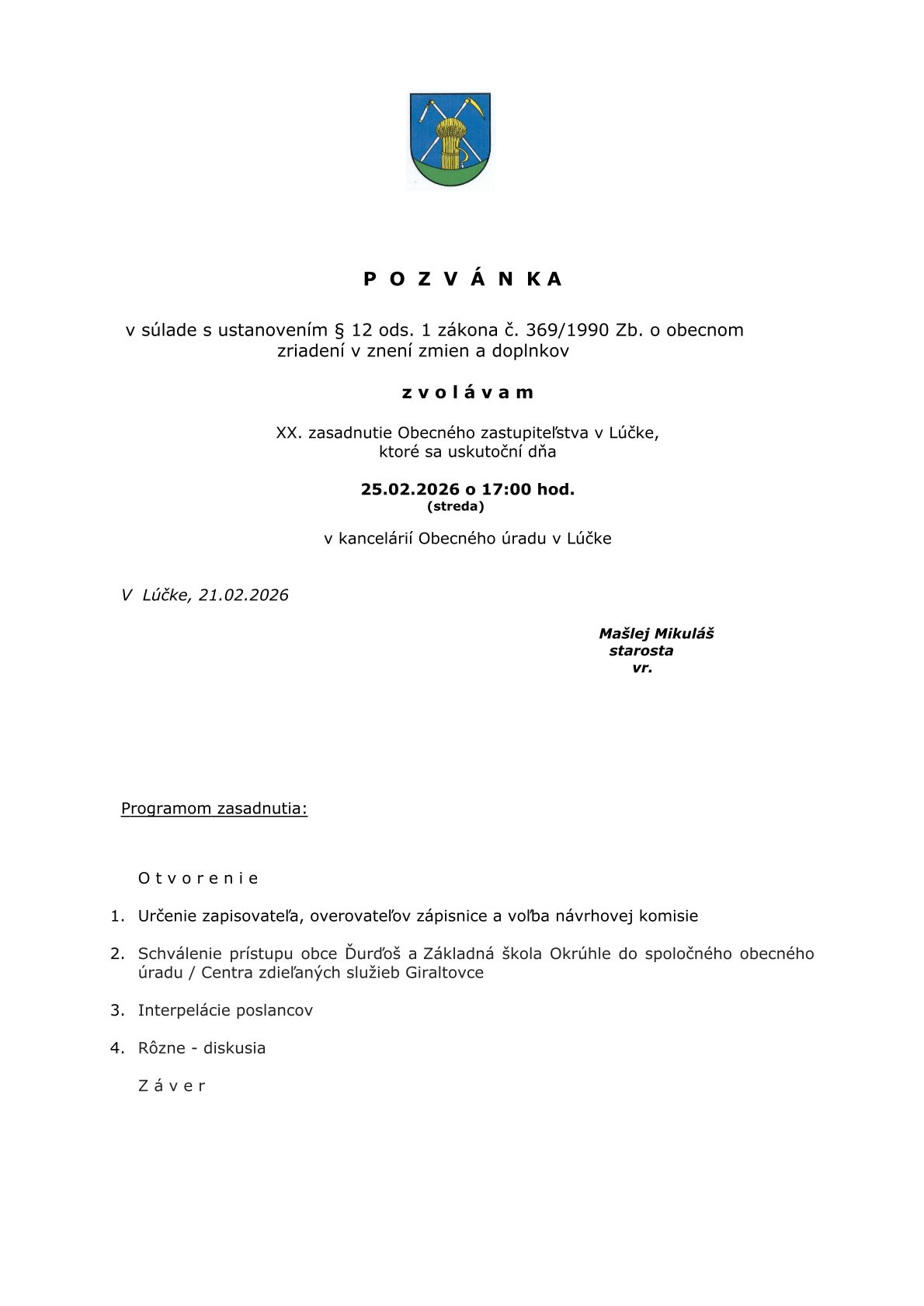 Pozvánka na XX. zasadnutie Obecného zastupiteľstva obce Lúčka